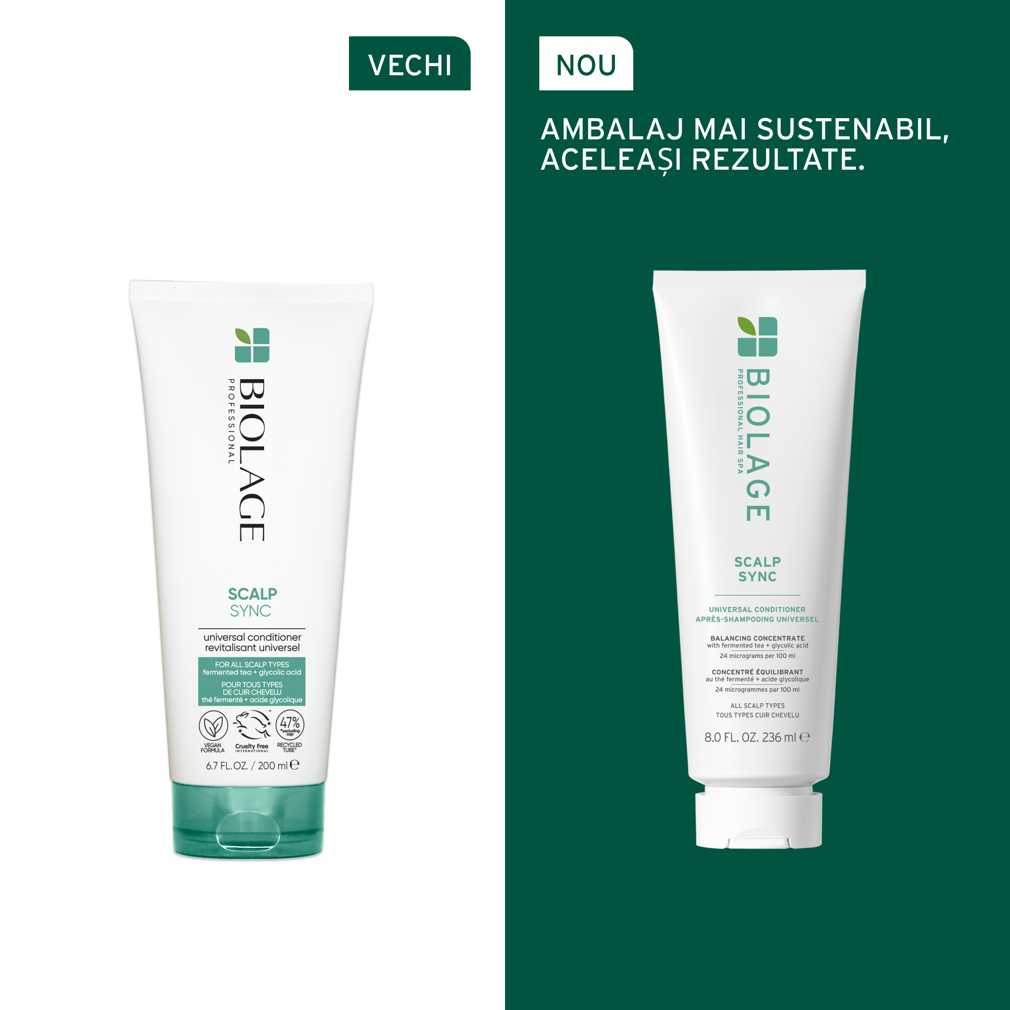 Biolage Scalp Sync Universal Conditioner este un balsam cu textura usoara, formulat special pentru a echilibra si hrani toate tipurile de scalp: uscat, sensibil, gras sau predispus la matreata. Imbogatit cu ceai fermentat si acid glicolic, acest balsam ofera hidratare si confort scalpului, lasand parul moale, neted si stralucitor. Compatibil cu orice sampon din gama Scalp Sync.