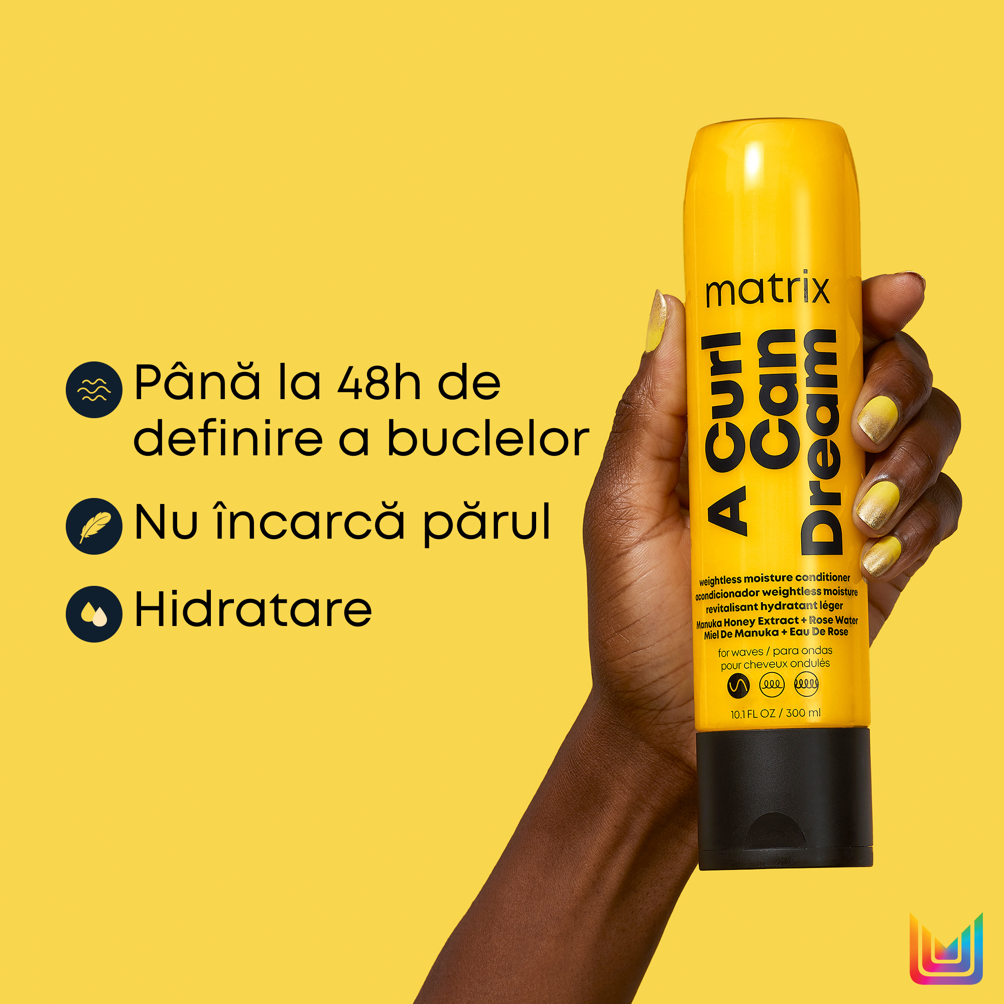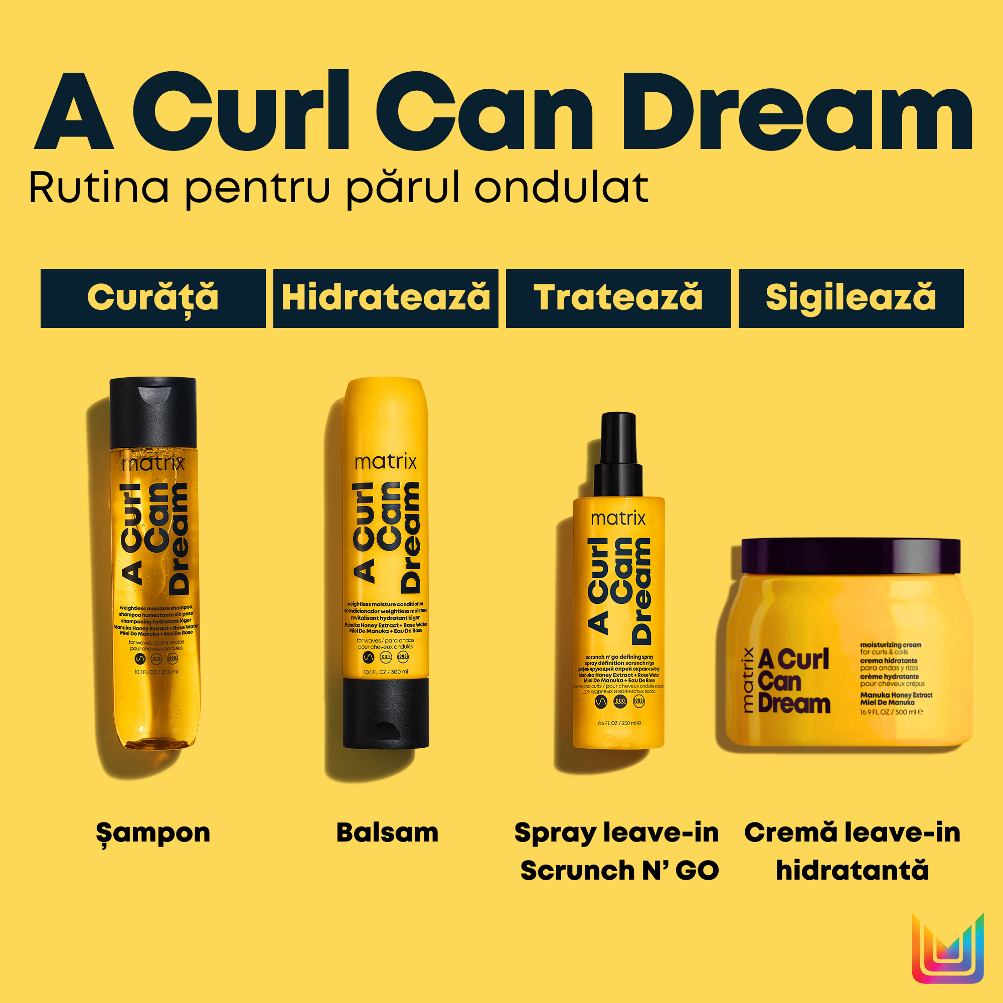 Descopera balsamul ideal pentru parul ondulat din gama Matrix A Curl Can Dream, creat special pentru a hidrata, defini si proteja buclele timp de pana la 48 de ore. Formula usoara, infuzata cu extract de miere de manuka si apa de trandafiri, ofera hidratare intensa fara sa incarce parul, reducand efectul de frizz si imbunatatind manevrabilitatea.
