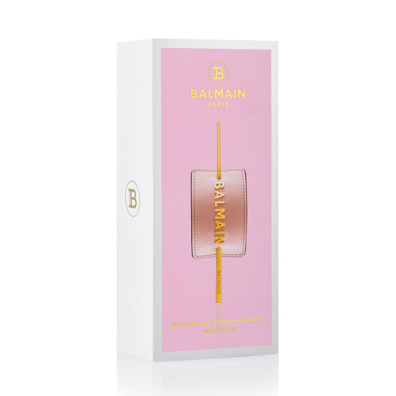 Agrafa de păr este realizată manual din piele veritabilă de cea mai înaltă calitate și este prevăzută cu un sistem de prindere finisat manual, placat cu aur de 14 karate, gravat cu logo-ul Balmain. Pielea moale, embosată, este modelată astfel încât să înfășoare cu ușurință coafurile tip coadă de cal sau cocuri.