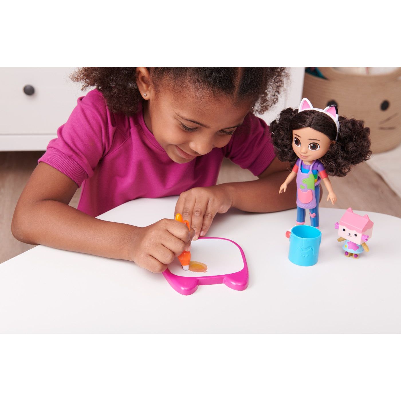 Alătură-te lui Gabby și Bebe Căsuță, în timp ce lucrați împreună toți trei pentru a retrăi momentele artistice preferate din serialul de succes Netflix, Casa de păpuși a lui Gabby. Apoi, folosește-ți imaginația pentru a crea propriile aventuri noi cu ajutorul setului de joacă Casa de păpuși a lui Gabby Creații Deluxe.