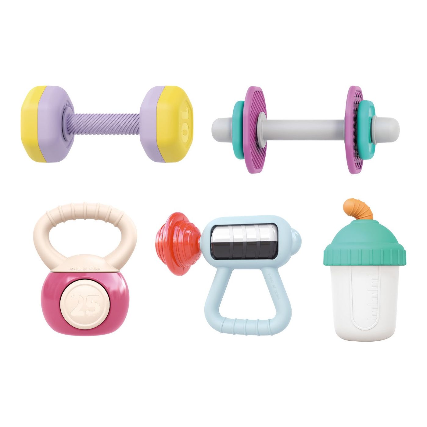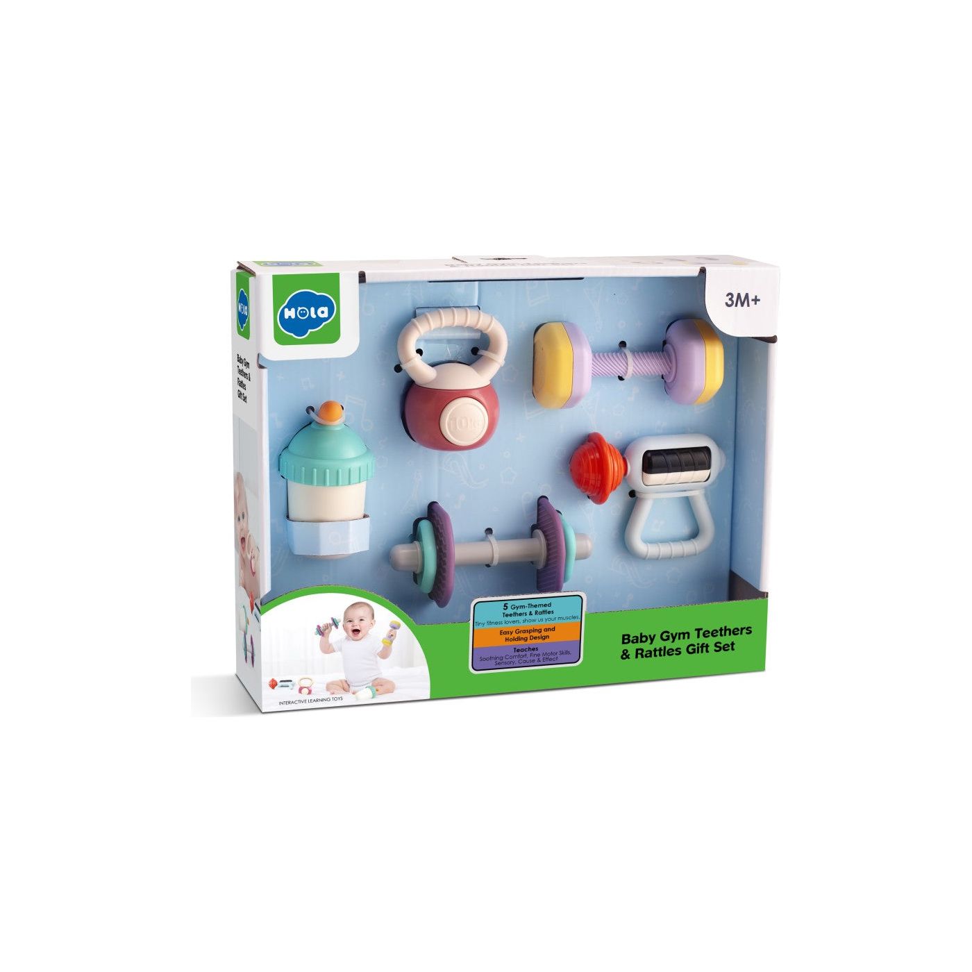 Setul de cadou Hola Baby Gym Teether and Hounds este o opțiune de cadou adorabilă și distractivă pentru cei mici. Dispune de un design jucăuș, cu tematică de sală de sport, care include dispozitive de dentiție și zornăitoare în formă de gantere, pistol de masaj, pahar cu apă și greutăți. Această colecție este perfectă pentru mâinile mici.