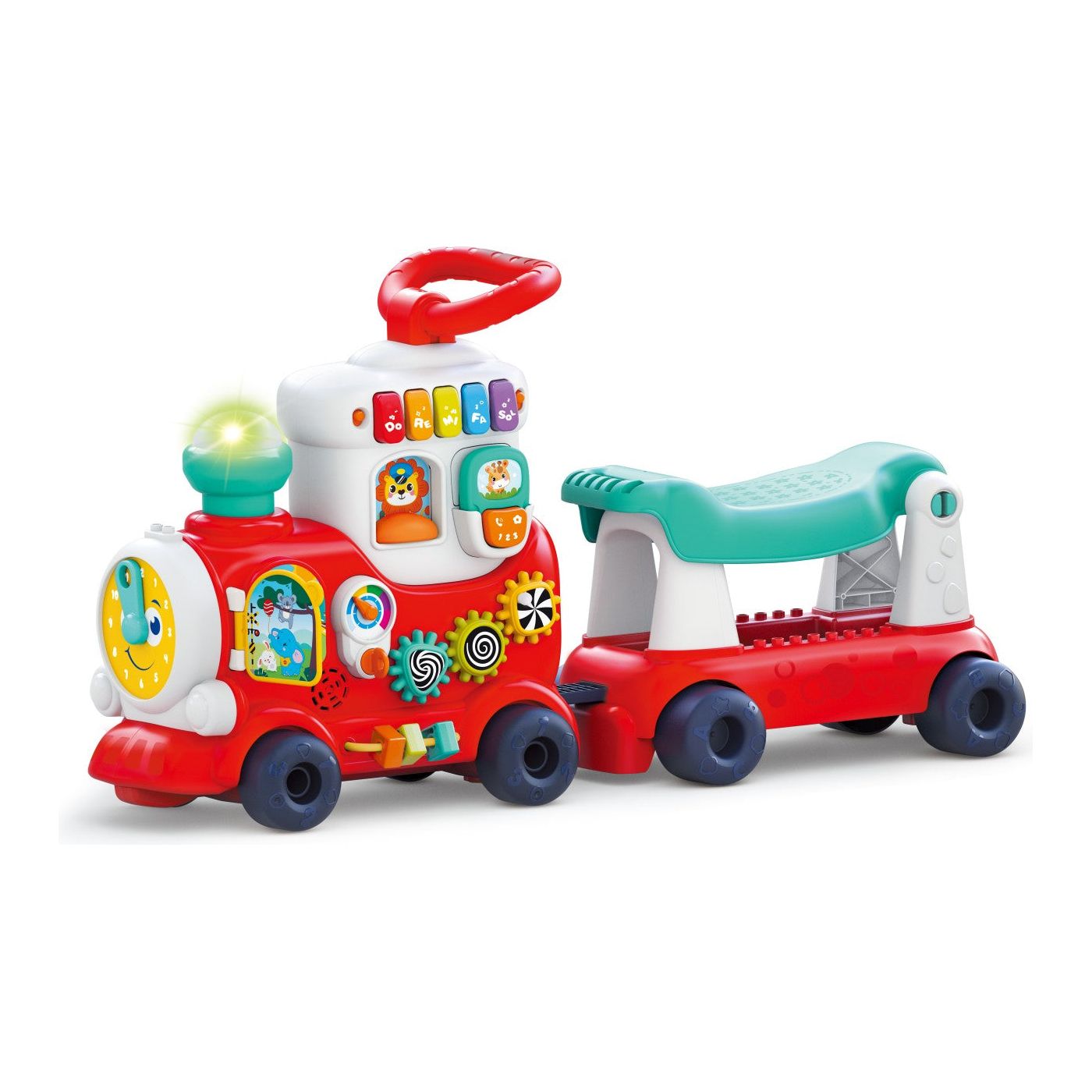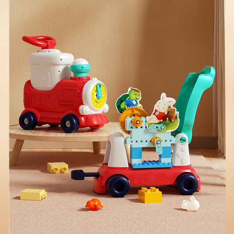 Apăsați butonul de jos al locomotivei pentru a scoate cu ușurință scaunul separat. Joacă așezată, plimbător, cărucior și cărucior de tragere – 4 tipuri de moduri de joacă pentru ca bebelușul să-și exercite dezvoltarea picioarelor și mâinilor. Un tren de jucărie cu o varietate de moduri de joc, 4 tipuri de exerciții, 9 tipuri de funcții educative. Joacă așezată, plimbător, călăreț și căruță de tragere. Simulați sunetul și scena luminii trenului. Explorarea mișcării mâinii.