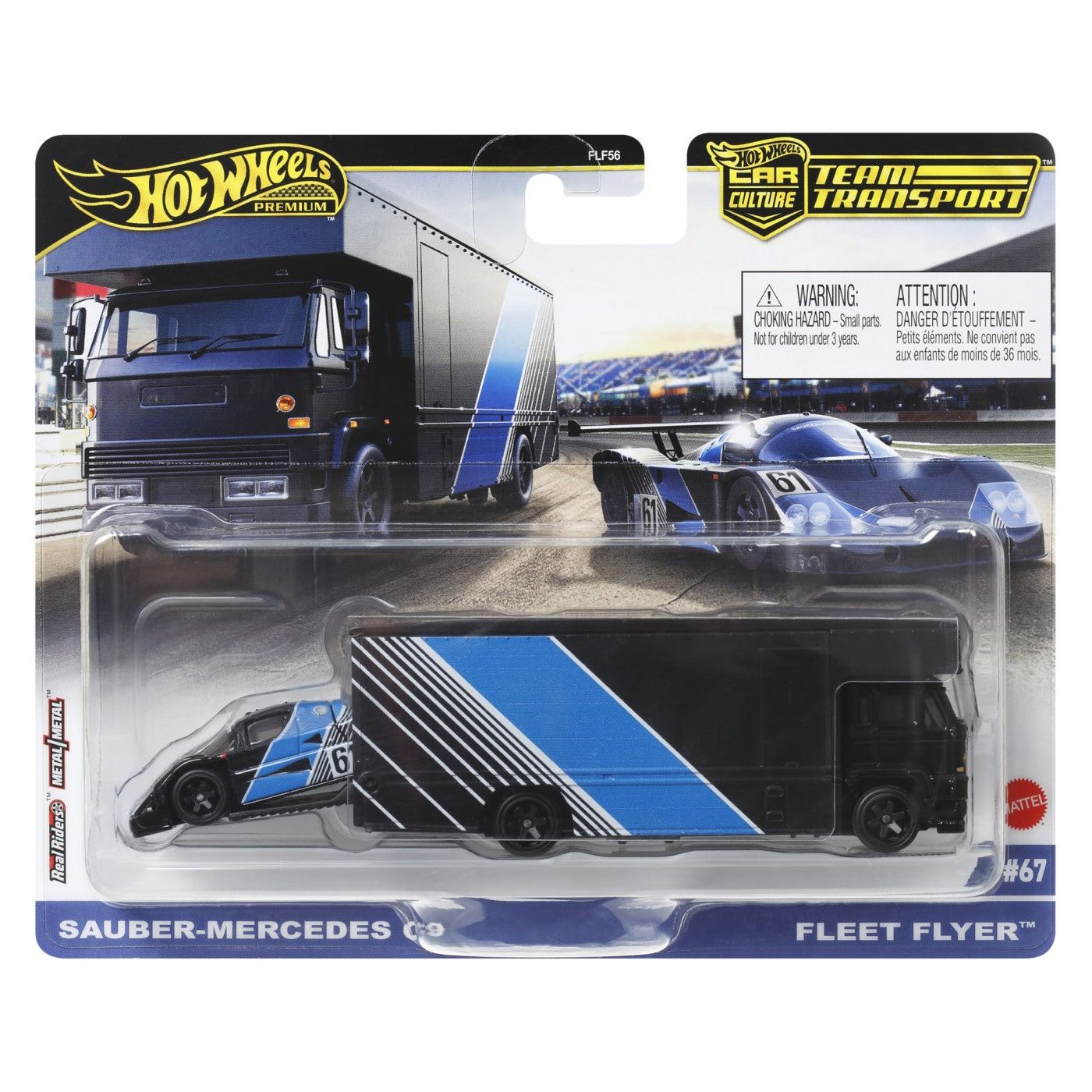 Setul contine un transportor Sauber Mercedes C9 si o masinuta Fleet Flyer.
