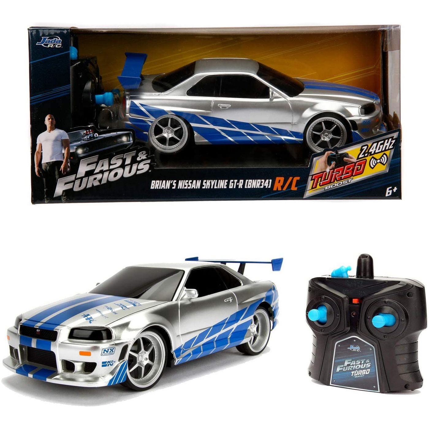 Mașinuța Jada Toys Nissan Skyline GTR poate fi controlată la distanță cu ajutorul telecomenzii la o frecvență de 2,4 Ghz.