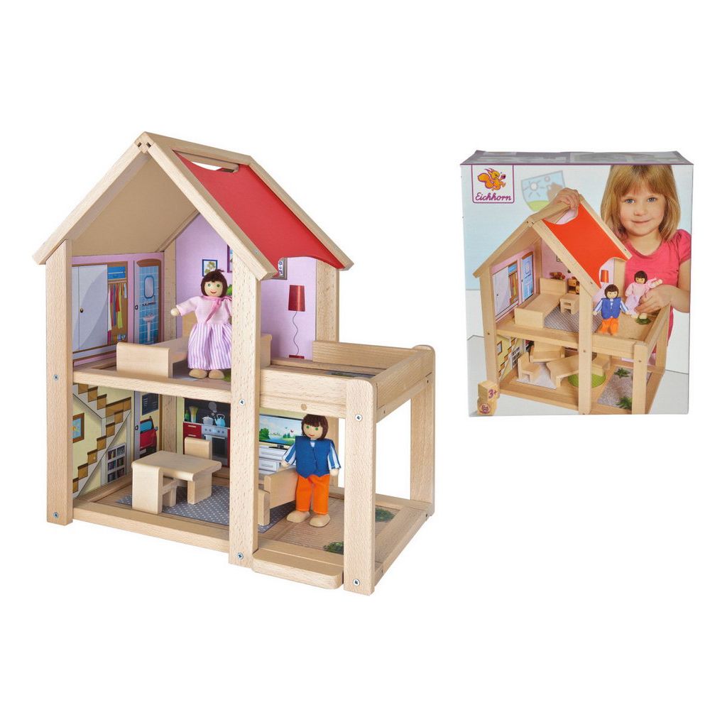 Căsuța de lemn pentru păpuși are 2 camere mari mobilate, o terasă și 2 păpuși (fată și băiat).
