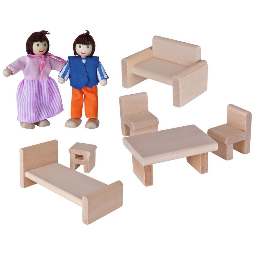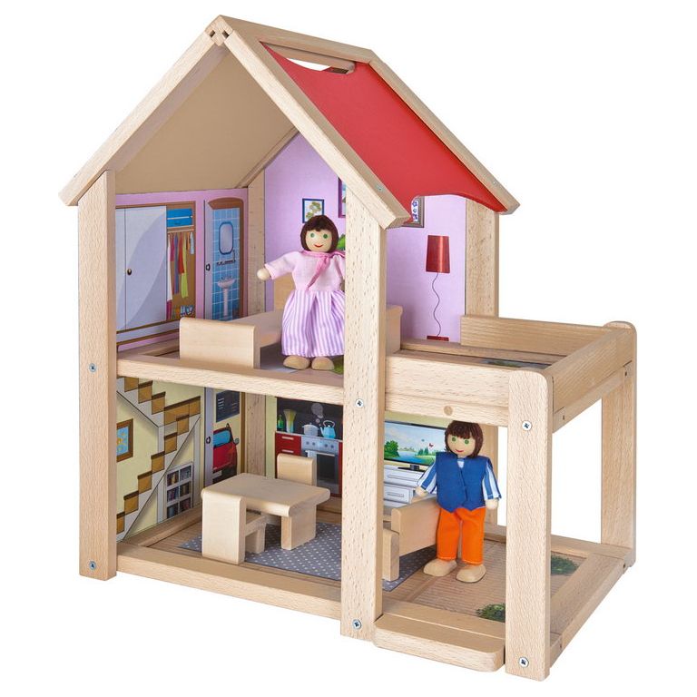 Cu această căsuță din lemn pentru păpuși și cu cele două păpuși din set, poți juca nenumărate aventuri și întâmplări.