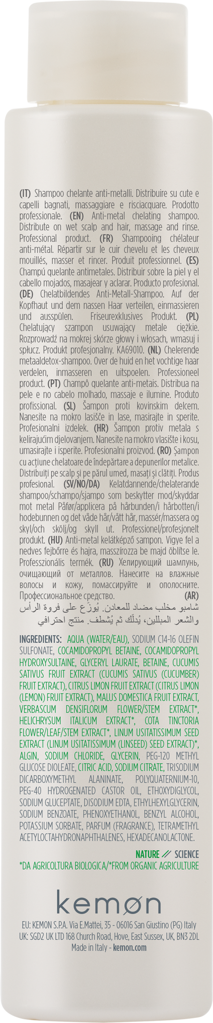 Formulat cu patru molecule sinergice care actioneaza in profunzimea firului de par pentru a elimina metalele grele, a neutraliza mineralele oxidante si a restabili puritatea fibrei capilare.