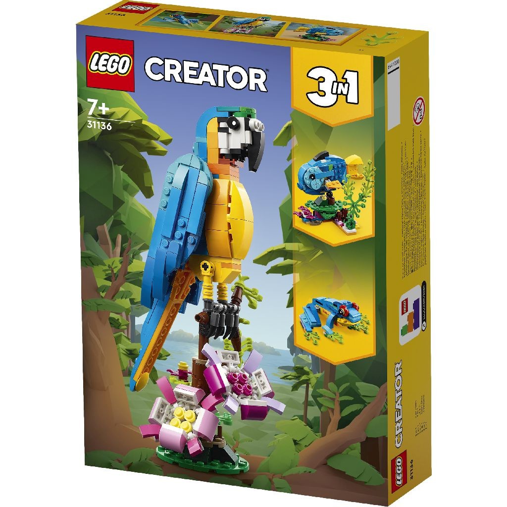Animale exotice de jucărie 3-in-1: Copiii în vârstă de 7+ ani pot pătrunde în pădurea tropicală cu setul LEGO Creator 3-in-1 Papagal exotic (31136), care conține un papagal, un pește și o broscuță.