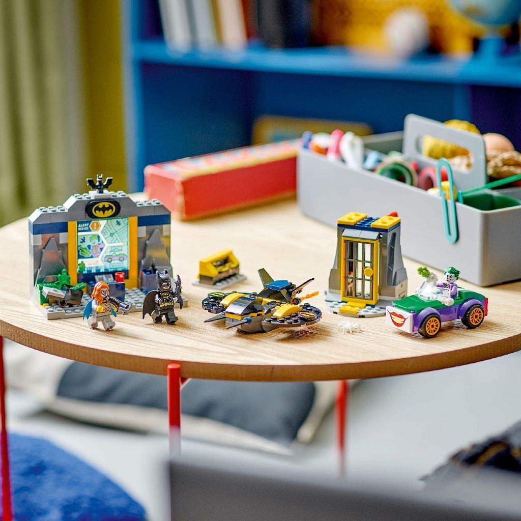 Pe lângă Batcave, această jucărie formidabilă include și 3 minifigurine: Batman, Batgirl și Joker, un avion Batwing cu aripi pliabile, o mașină pusă în mișcare prin împingere, un lansator de discuri, o celulă de închisoare și accesorii distractive, între care un păianjen care strălucește în întuneric. Dotările interactive includ o catapultă activată printr-un comutator și uși de închisoare care explodează.