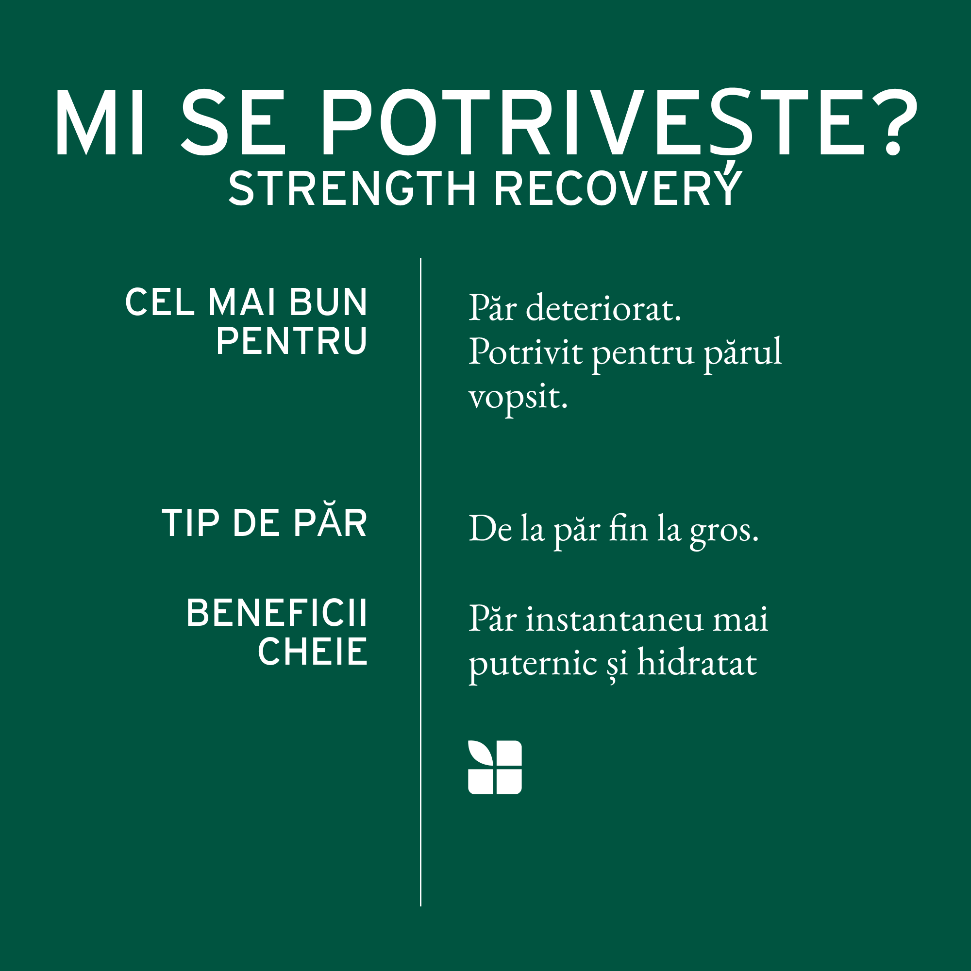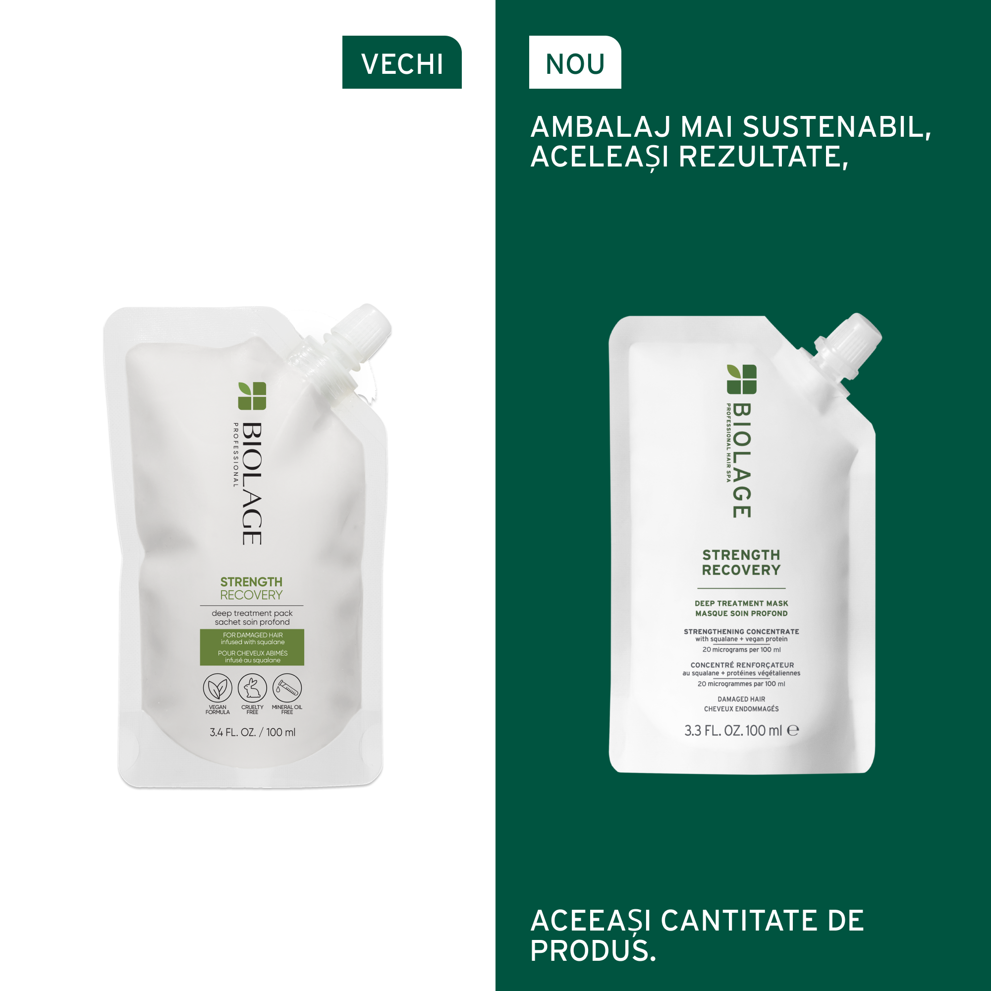 Parul tau este fragil, deteriorat si predispus la rupere? Masca tratament intensiva Biolage Strength Recovery ofera o regenerare profunda si o protectie eficienta impotriva deteriorarii. Imbogatita cu squalan de masline si proteine vegane, formula hraneste si repara fibra capilara, netezind varfurile despicate si imbunatatind elasticitatea parului. Rezultatul este un par de 3 ori mai puternic, vizibil mai sanatos, stralucitor si usor de coafat.