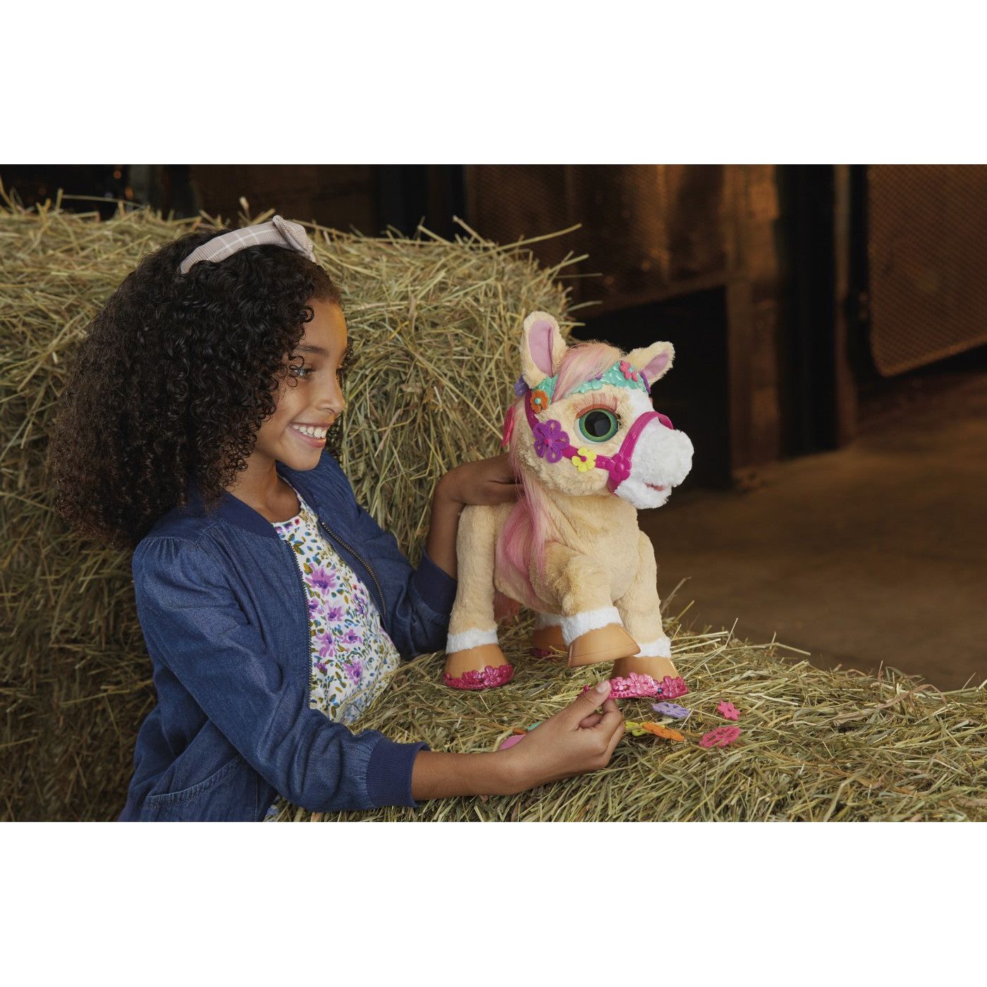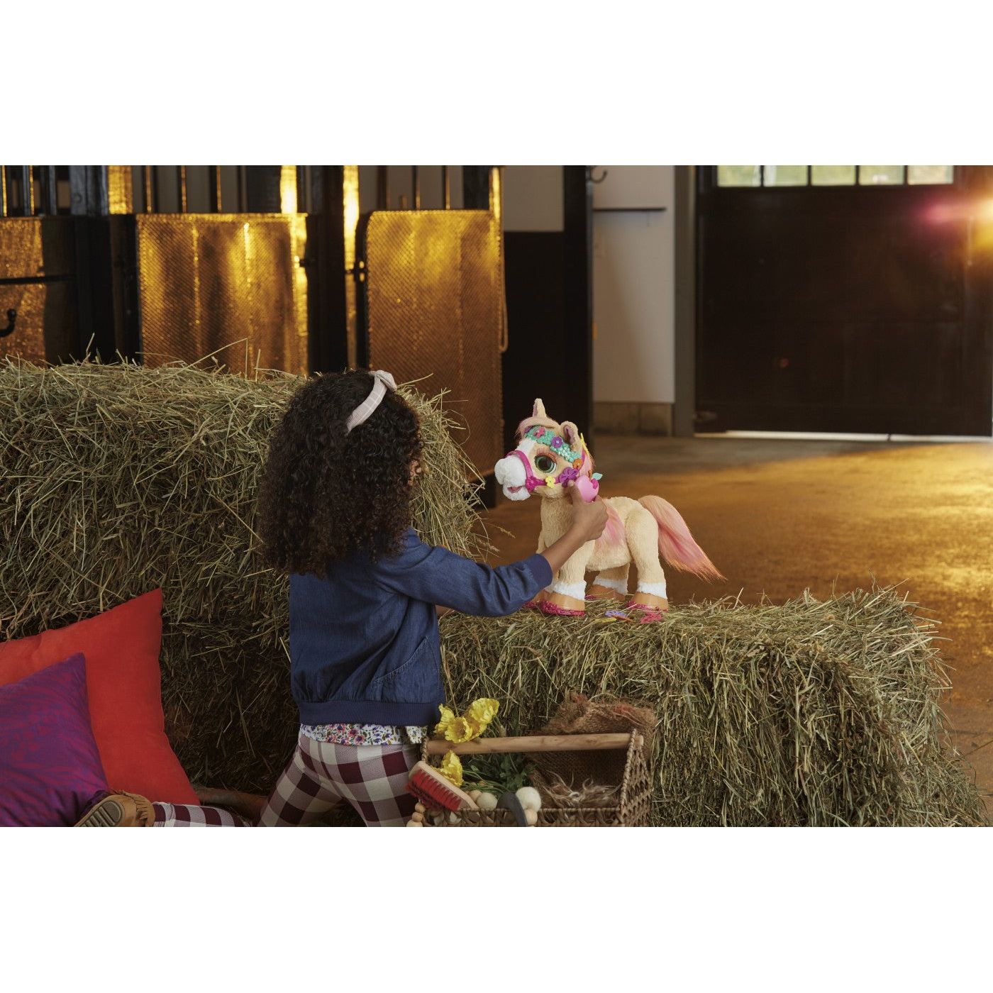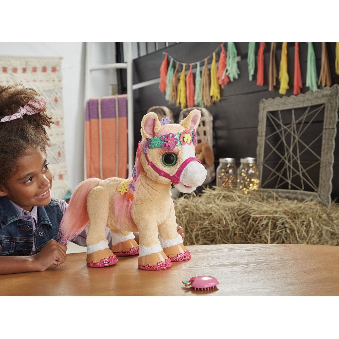 Cinnamon este un ponei premiat si este un adorabil animal de companie din plus. Jucaria are peste 80 de sunete si reactii. Este atat de expresiva! Clipeste din ochi, isi misca urechile, capul si gatul. Cinnamon reactioneaza cand o mangai pe spate sau pe obraji, cand o saruti pe nas sau cand ii dai de mancare. Ba chiar sarbatoreste cand ii dai panglica albastra! Accesoriile sale includ o perie 2 in 1 cu recompensa, 4 potcoave, flori pentru stilizare si o panglica albastra.