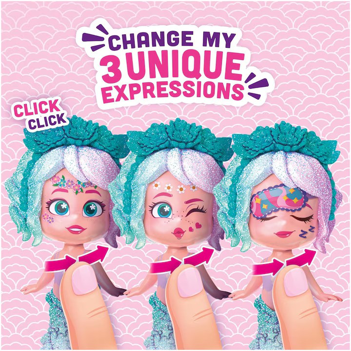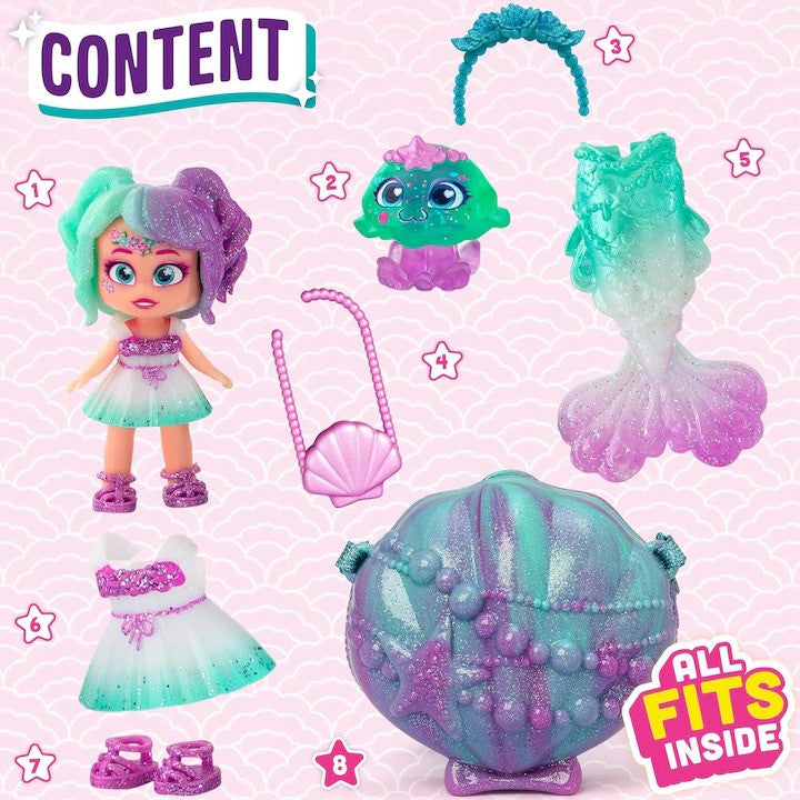 Setul include o papusa sirena adorabila cu coada detasabila, un animalut exclusiv, haine, pantofi si multe accesorii unice. Scoica speciala este mai mult decat un accesoriu – devine scena de joaca cu decoruri fantastice si se transforma intr-o geanta pentru a lua totul cu tine oriunde.