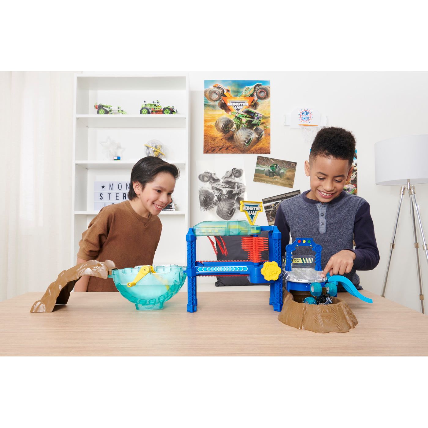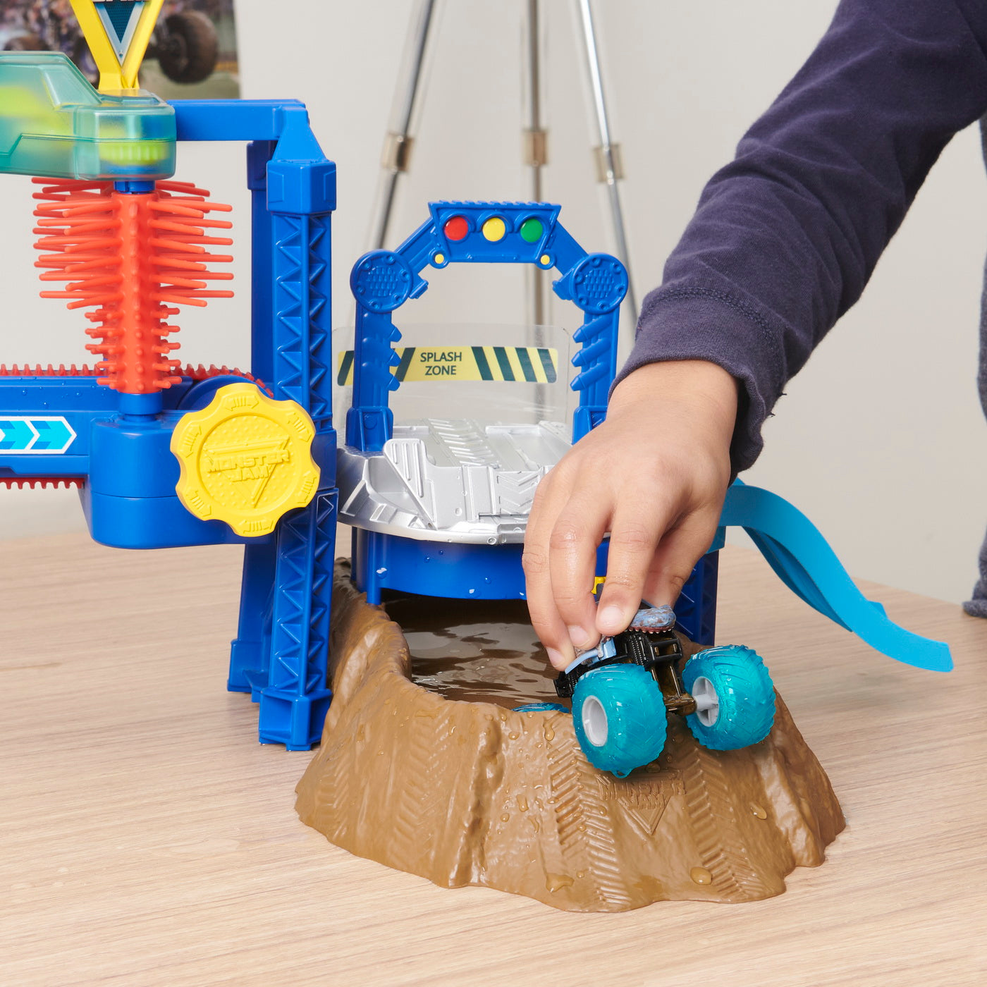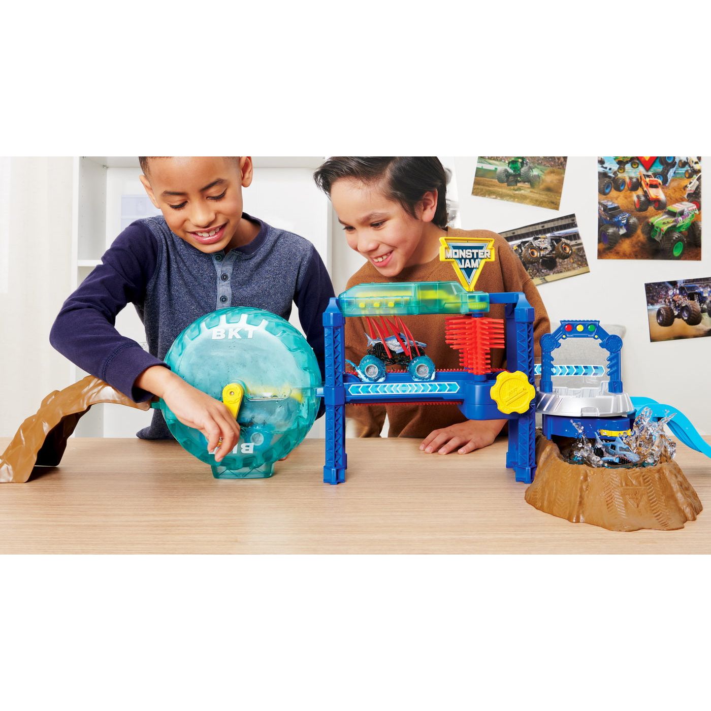 Megalodon Monster Wash este cel mai curat mod de a te murdări! Spălătoria are o lungime de peste 90 cm și duce camioanele compatibile Monster Jam de la murdărie la curățare într-un timp foarte scurt.