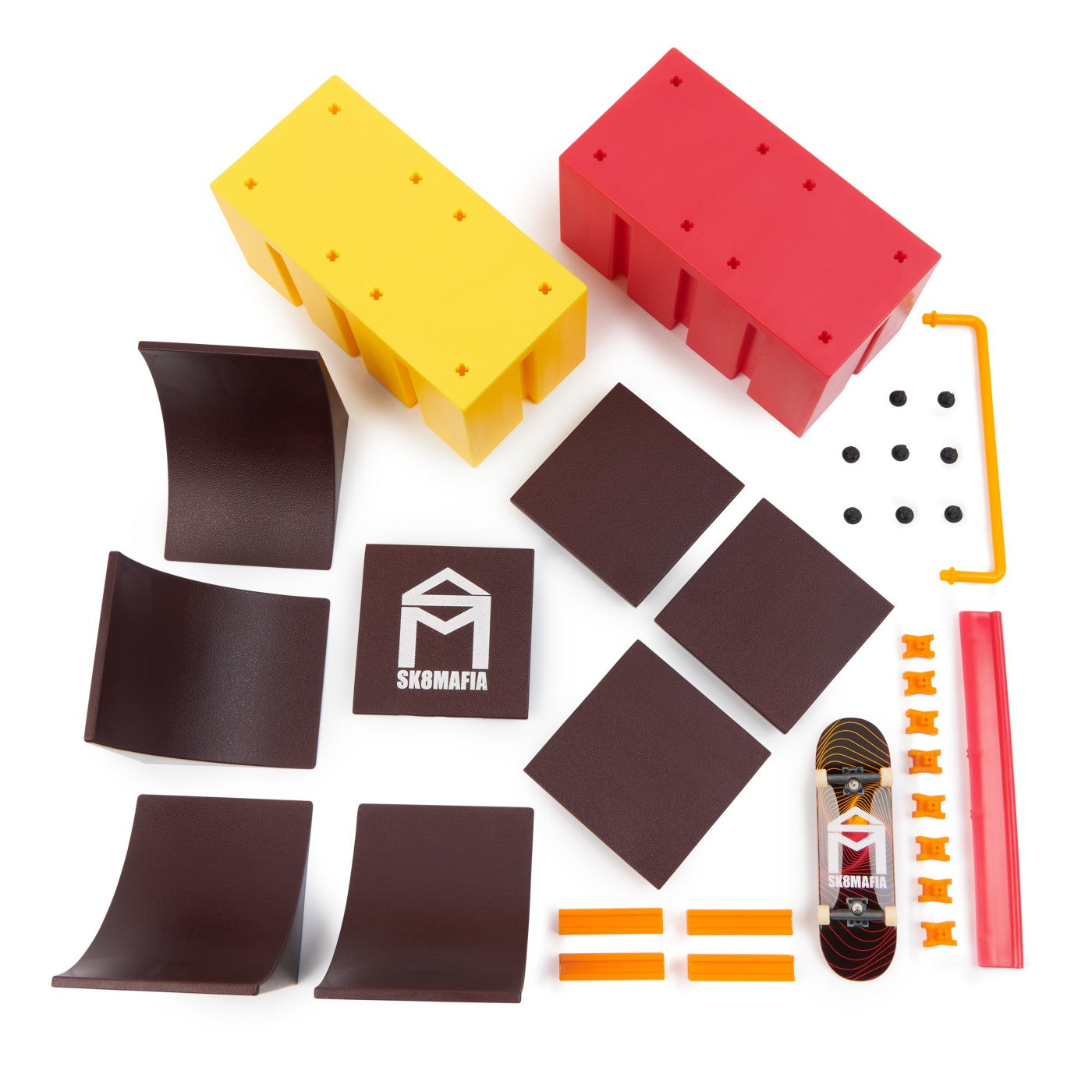 Configurează diferite combinații cu rampele vert, rampa wedge și subrail-ul pentru a învăța și a-ți îmbunătăți trick-urile. Adaugă-l la colecția ta de skateboard-uri pentru degete și dă-te cu noul tău fingerboard exclusiv Sk8Mafia Skateboards inclus în set. Are grafică de skate autentică de la companii de skate reale.