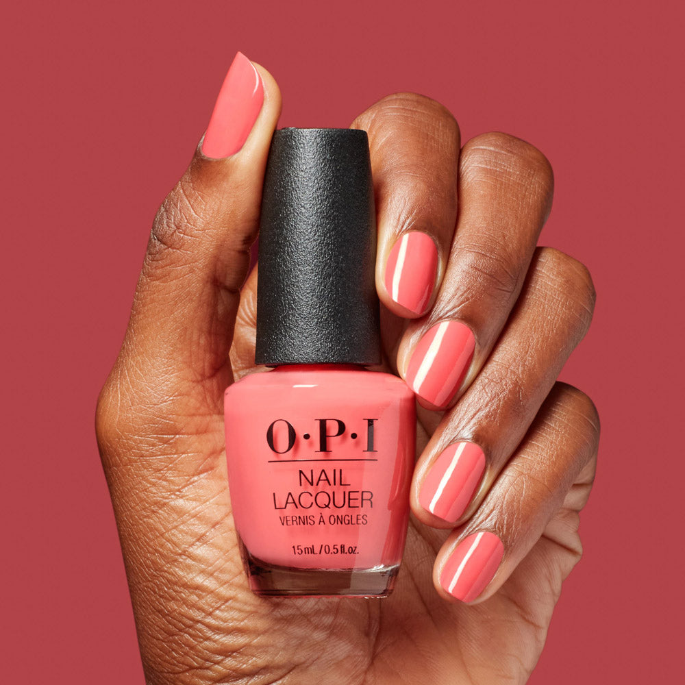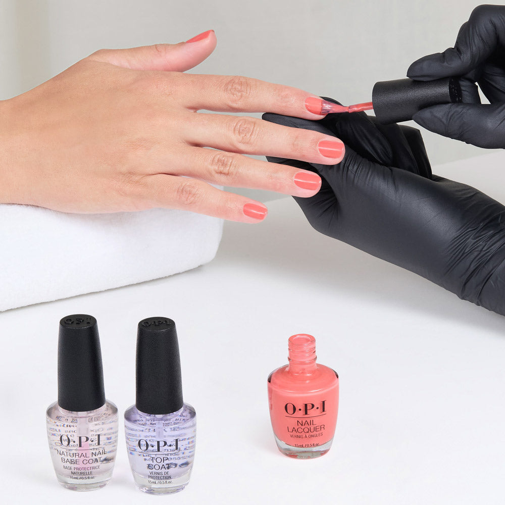 Pe unghia curată și uscată se aplică un strat de primer pentru unghii OPI Natural Nail Base Coat, urmat de două straturi de lac de unghii OPI Nail Lacquer, finalizând cu un strat de lac protector OPI Top Coat.