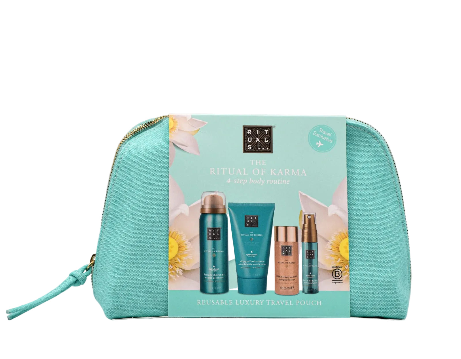 The Ritual of Karma Travel Pouch reprezinta o experienta luxoasa si completa de ingrijire a corpului, cu produse alese meticulos pentru a oferi o rasfatare senzoriala si pentru a mentine pielea catifelata si hidratata intr-un mod bland si eficient.