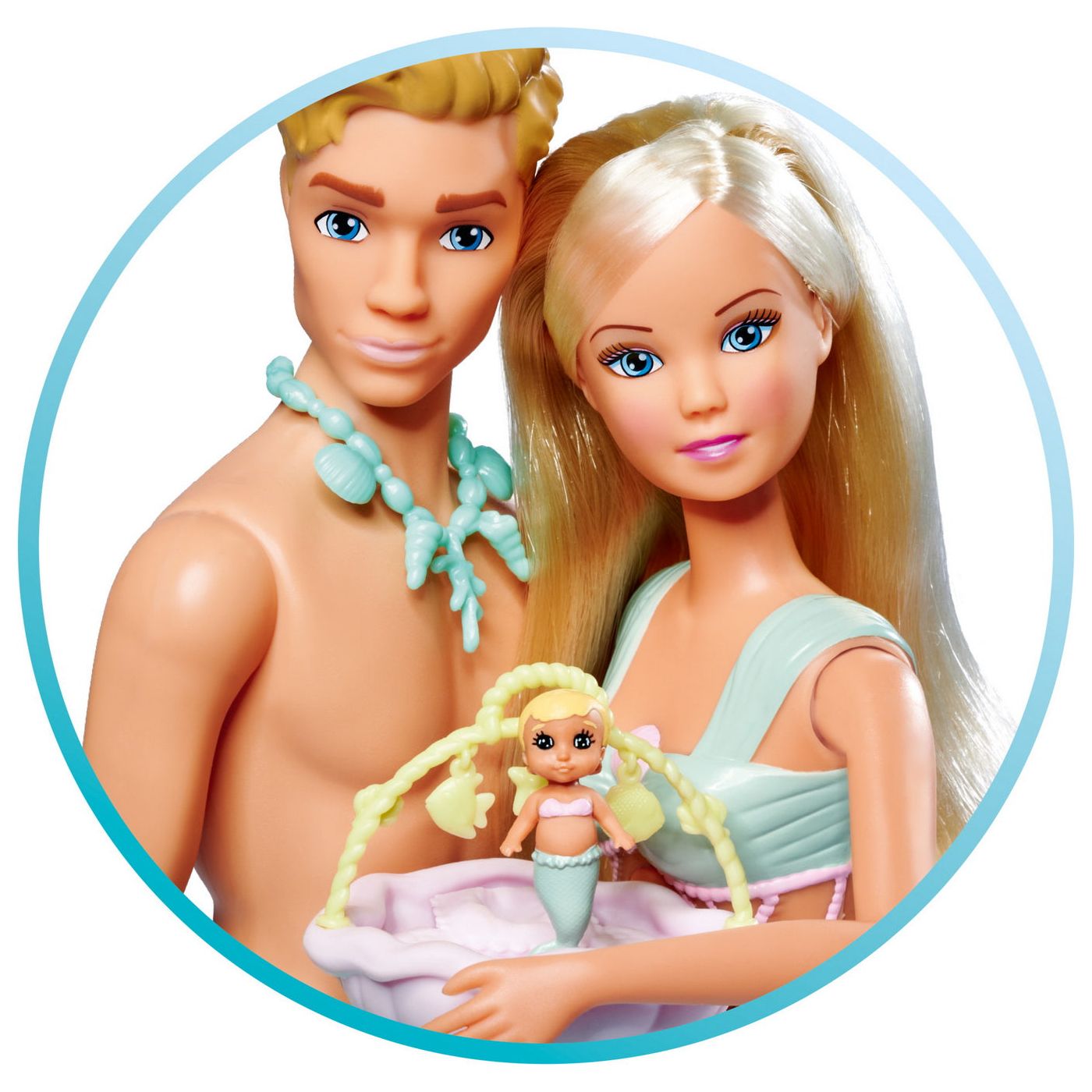 Set păpușă Steffi care este o sirenă însărcinată și așteaptă un copil împreună cu iubitul ei, Kevin.