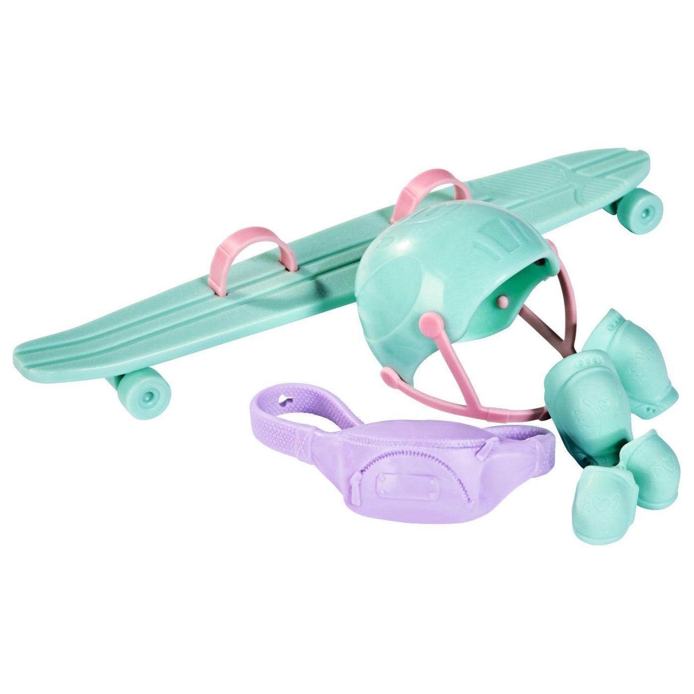 Steffi poarta o tinuta cool, cu longboard, protectii si casca si o geanta de umar.
