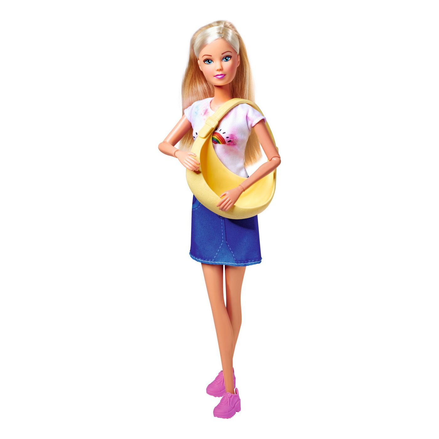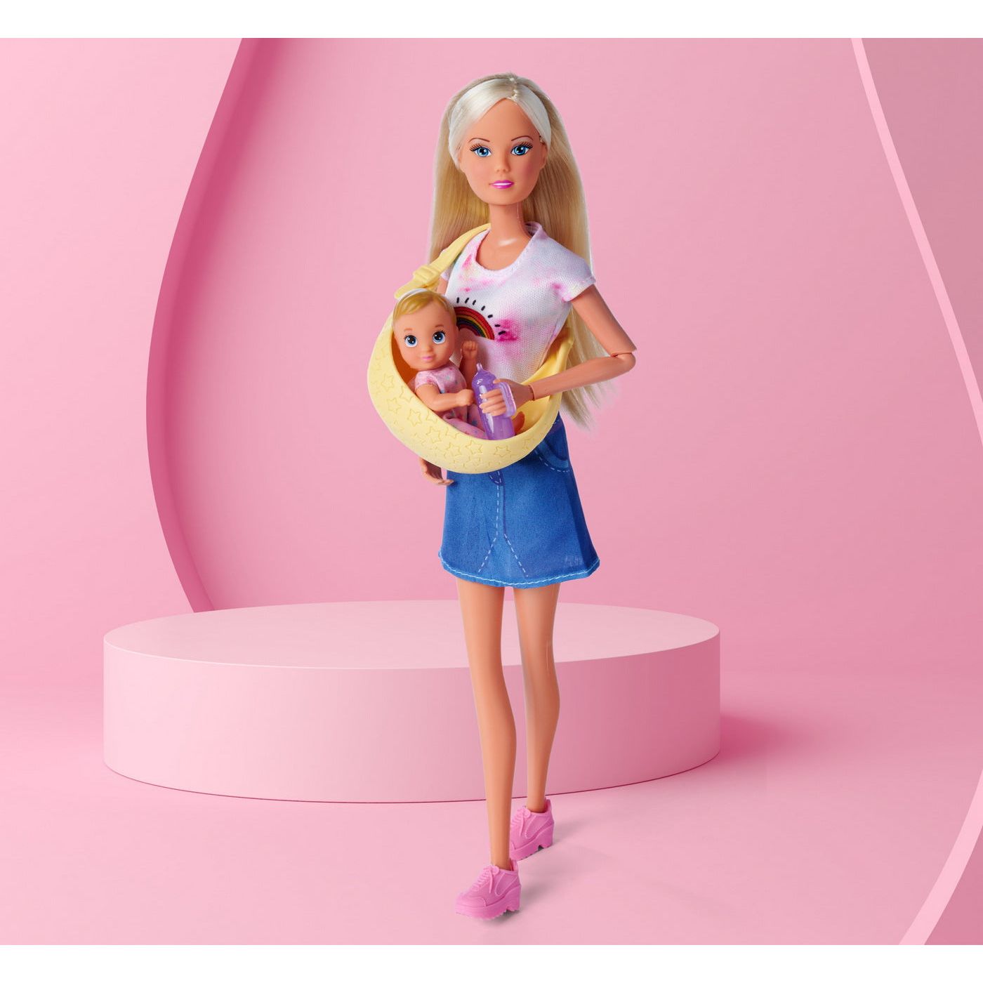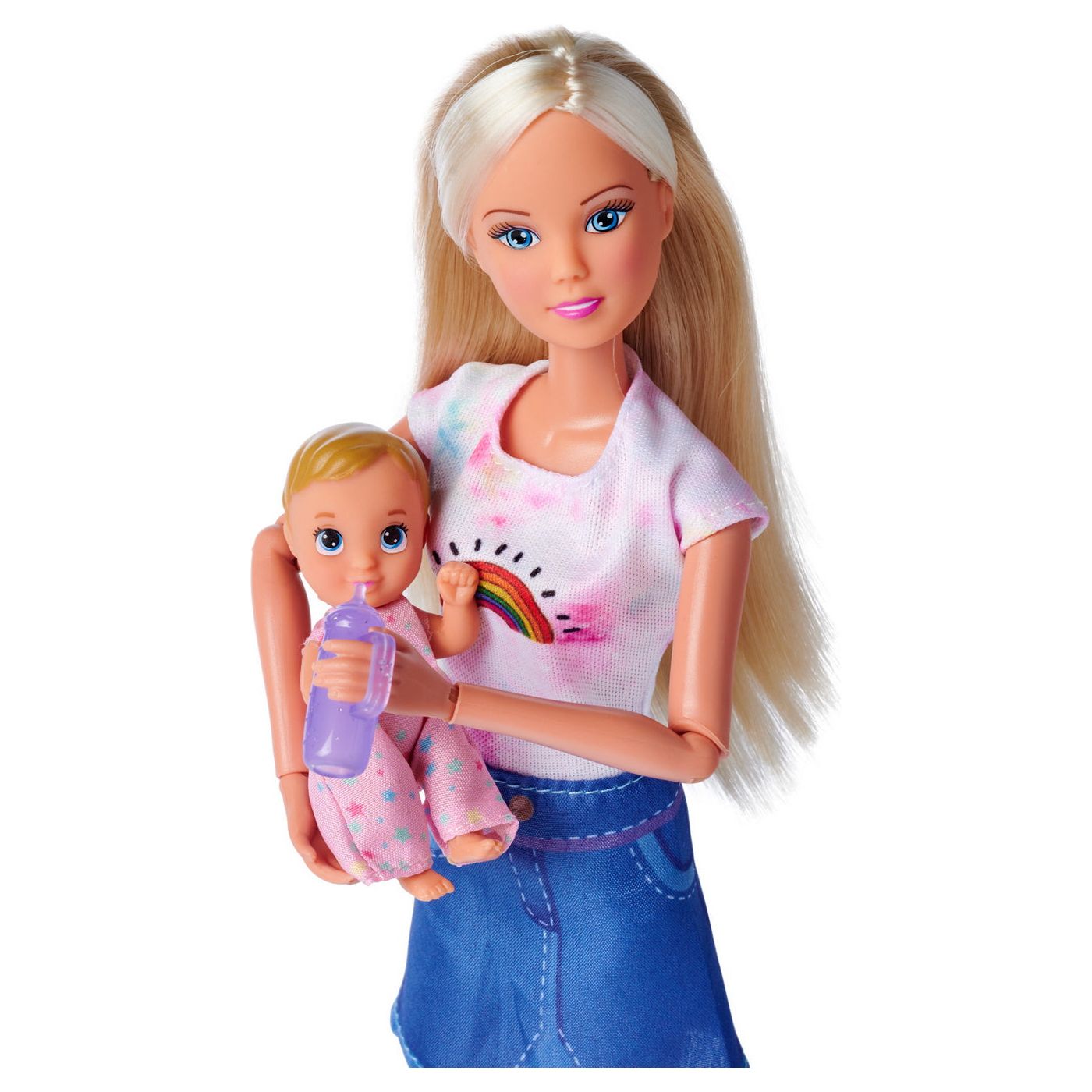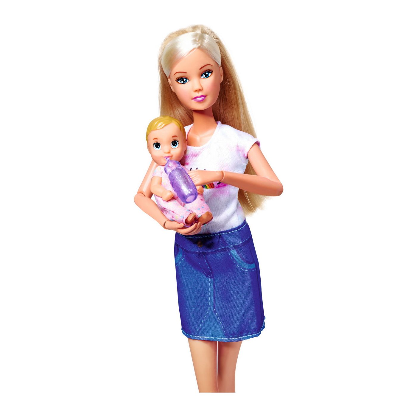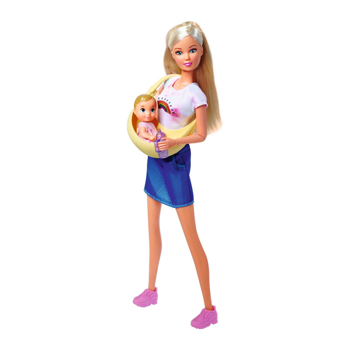 Steffi cu bebelușul ei dulce poate merge oriunde. Port bebe-ul este perfect pentru a ține un bebeluș, datorită căruia poate fi mereu aproape de mama lui. Biberonul atașat va facilita îngrijirea zilnică a bebelușului.