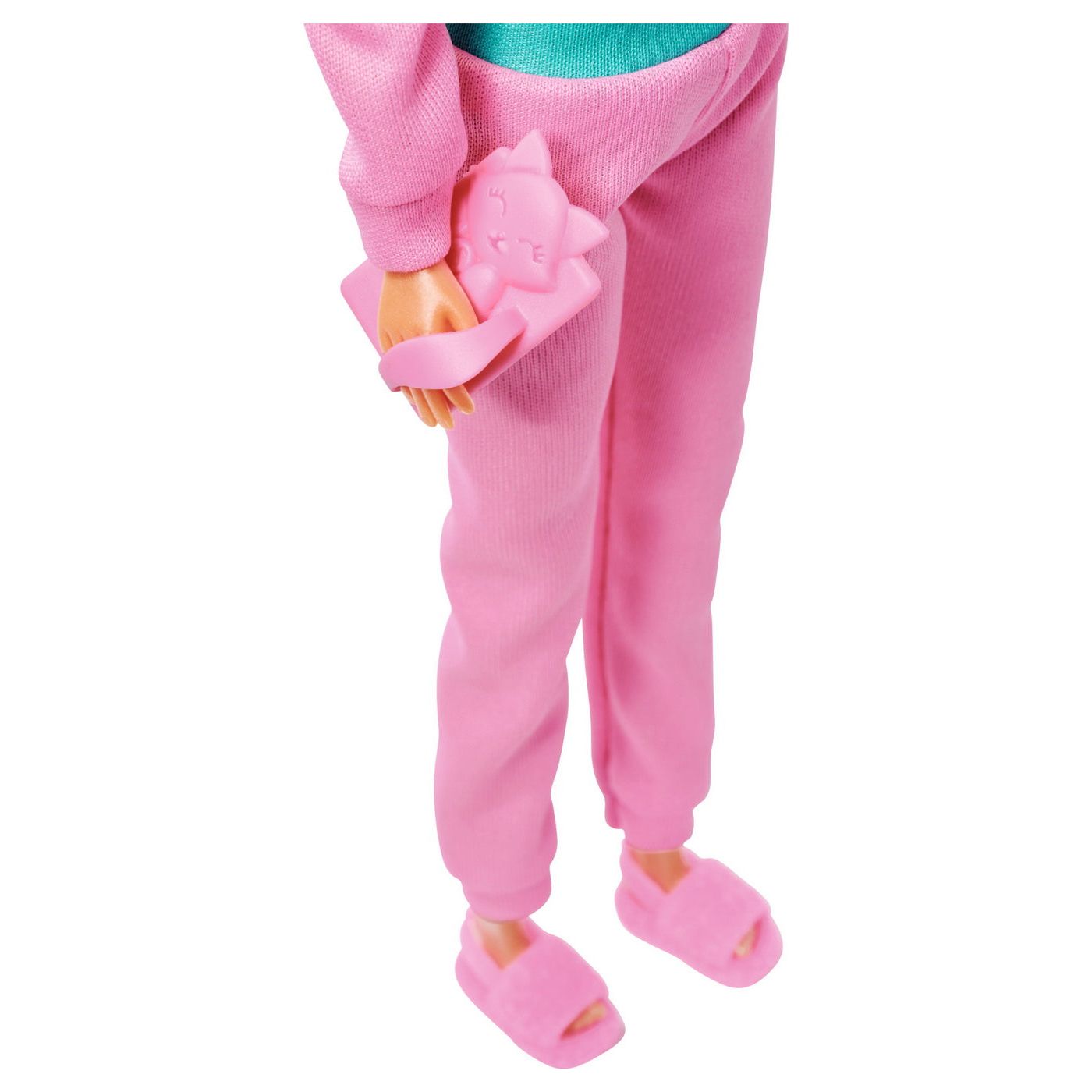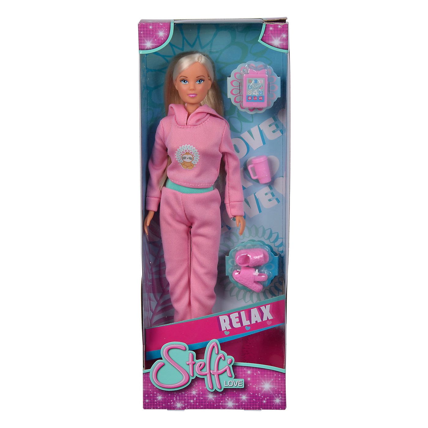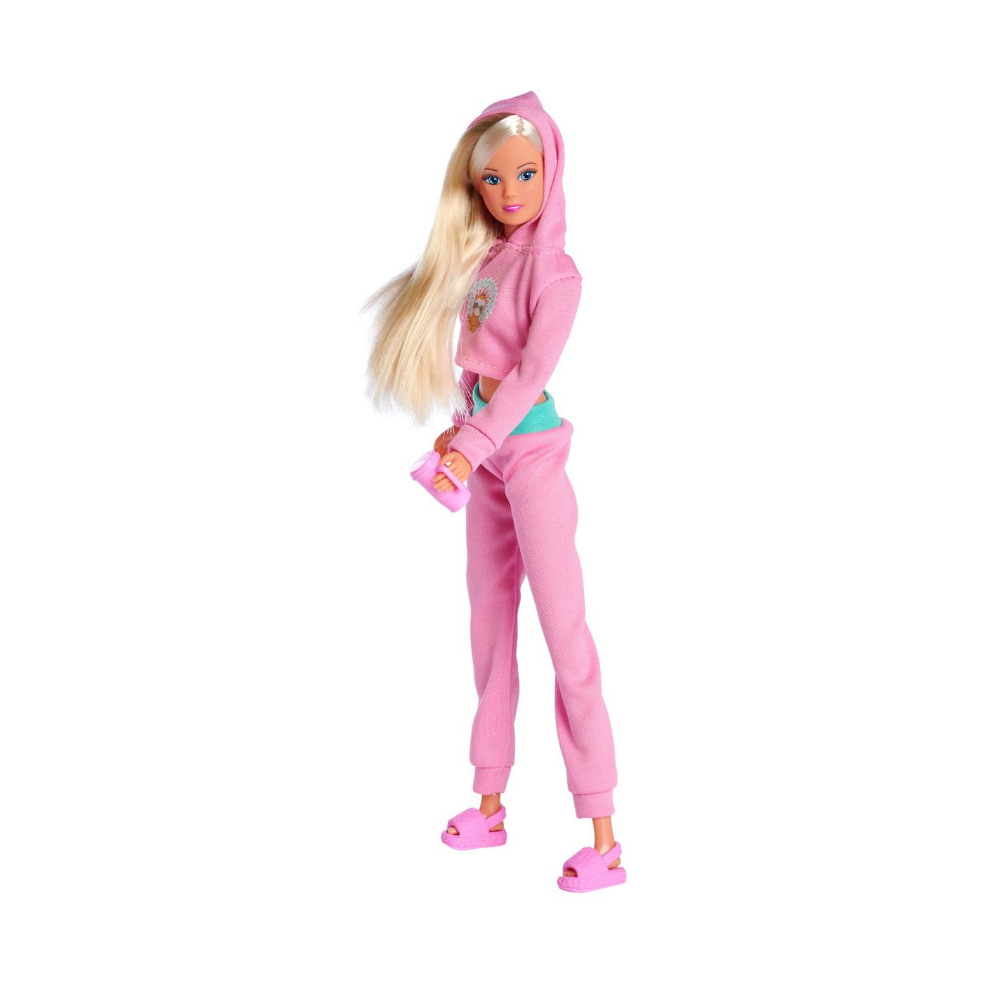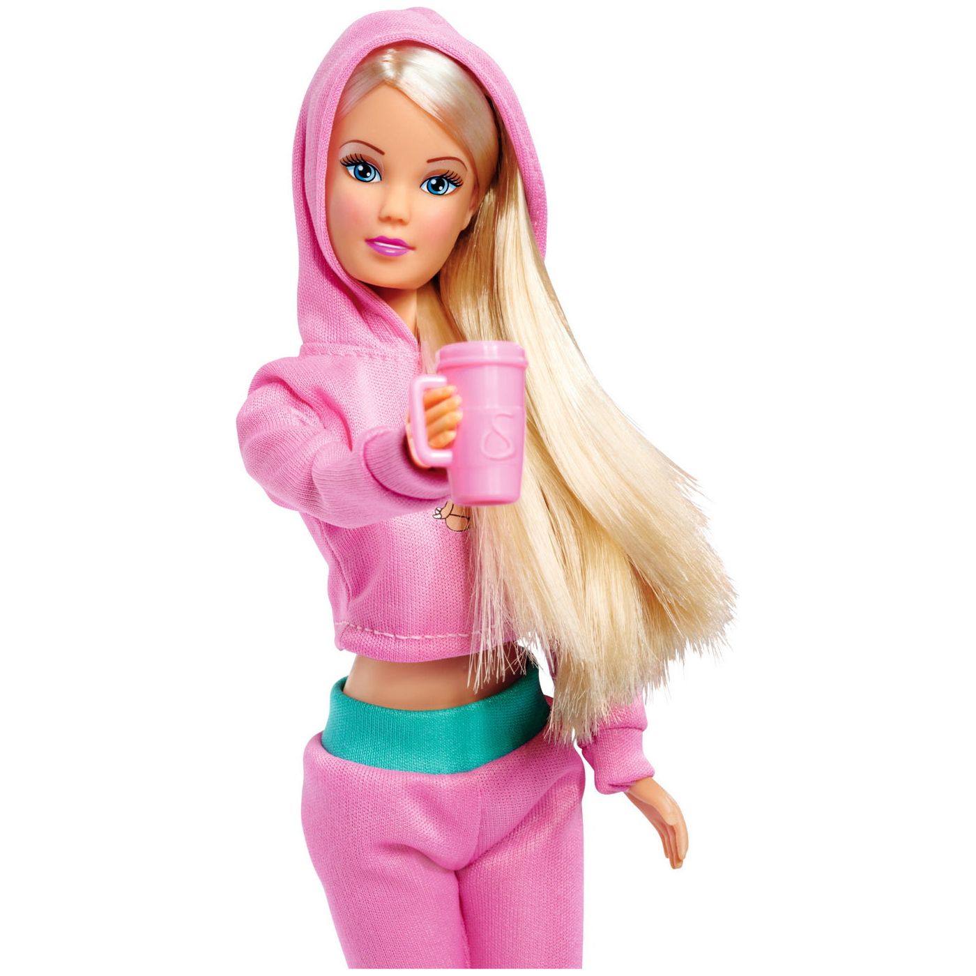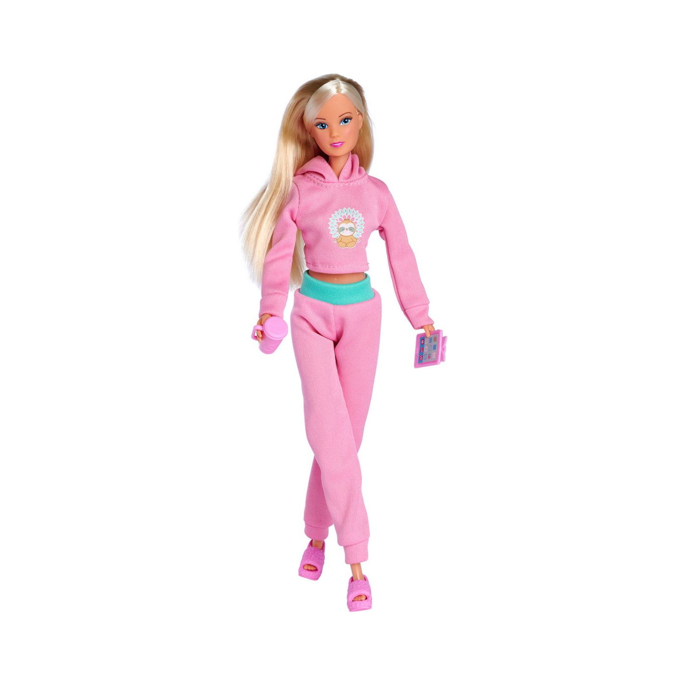 Steffi LOVE este o adevărată păpușă de modă. Are o ținută confortabilă. Costumul la modă din două piese al lui Steffi este format din pantaloni roz comozi, cu o curea verde și un hanorac asortat cu un design drăguț.