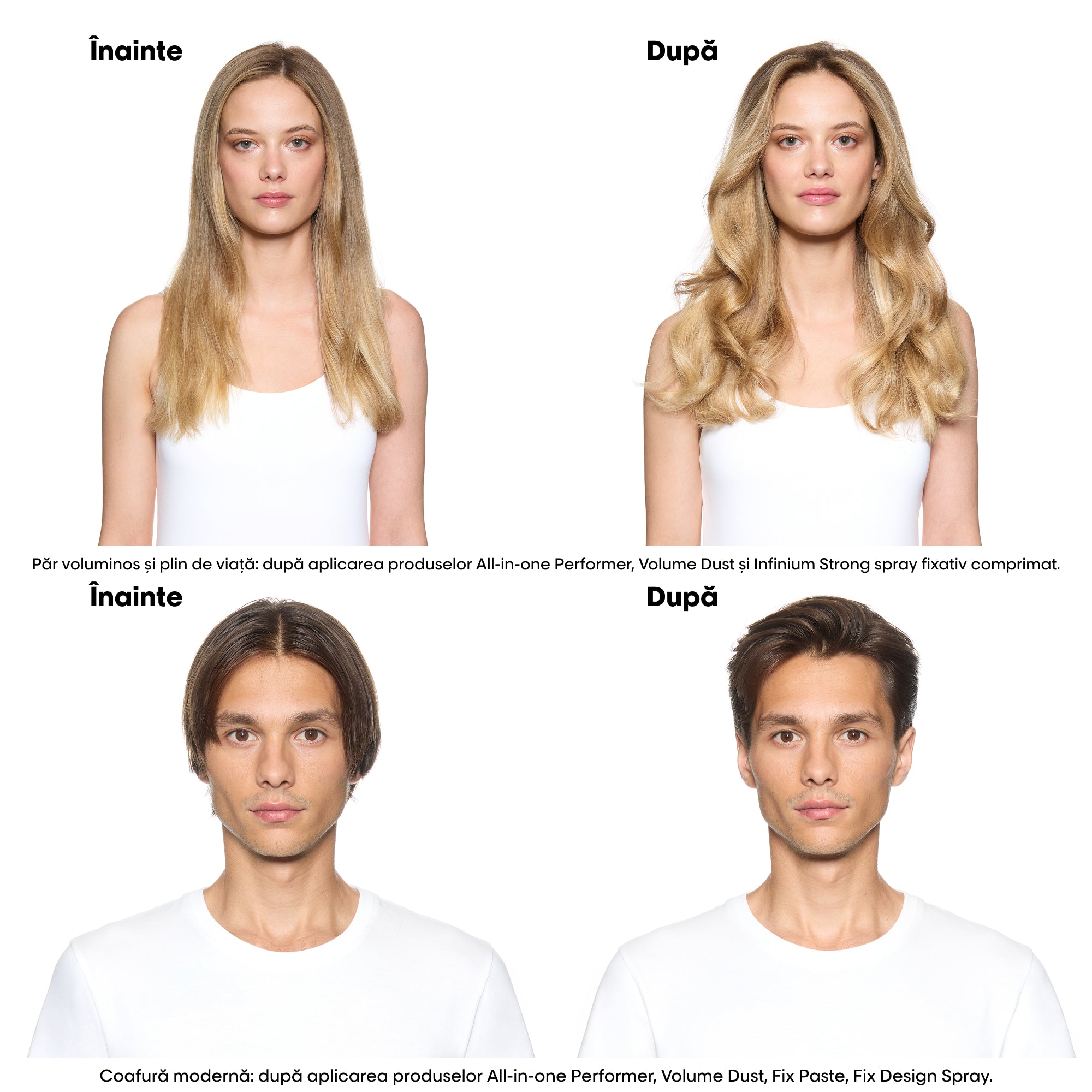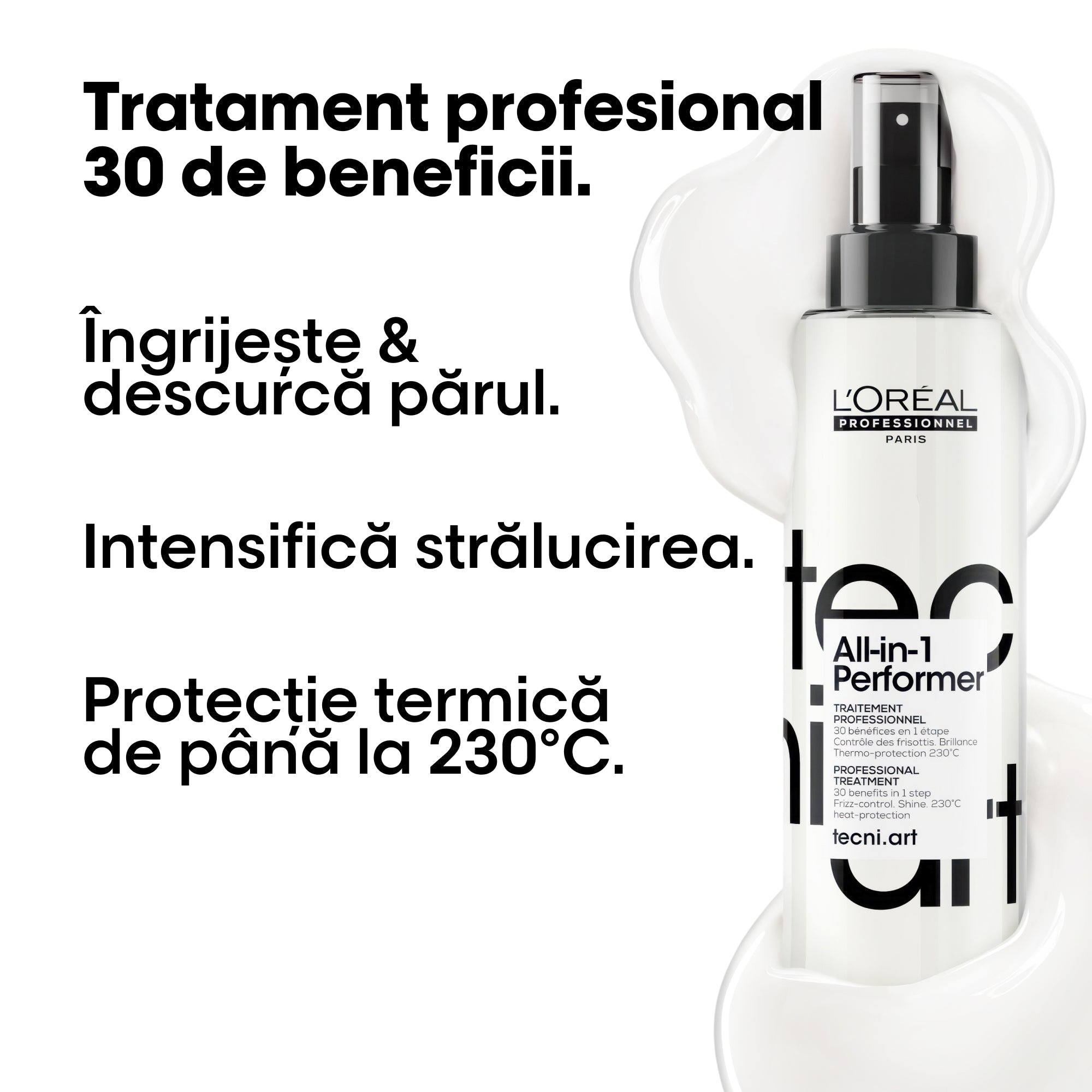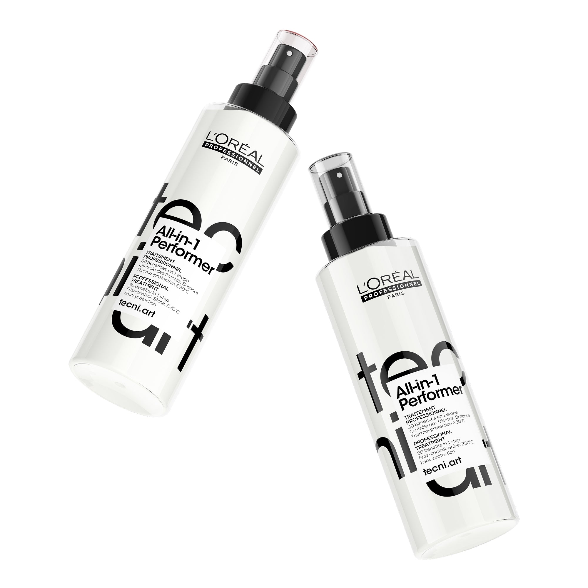 Parte din gama Tecni.art, creată împreună cu stiliști profesioniști, spray-ul All-in-1 Performer este ideal ca bază de coafat, fiind compatibil cu orice produs de styling.